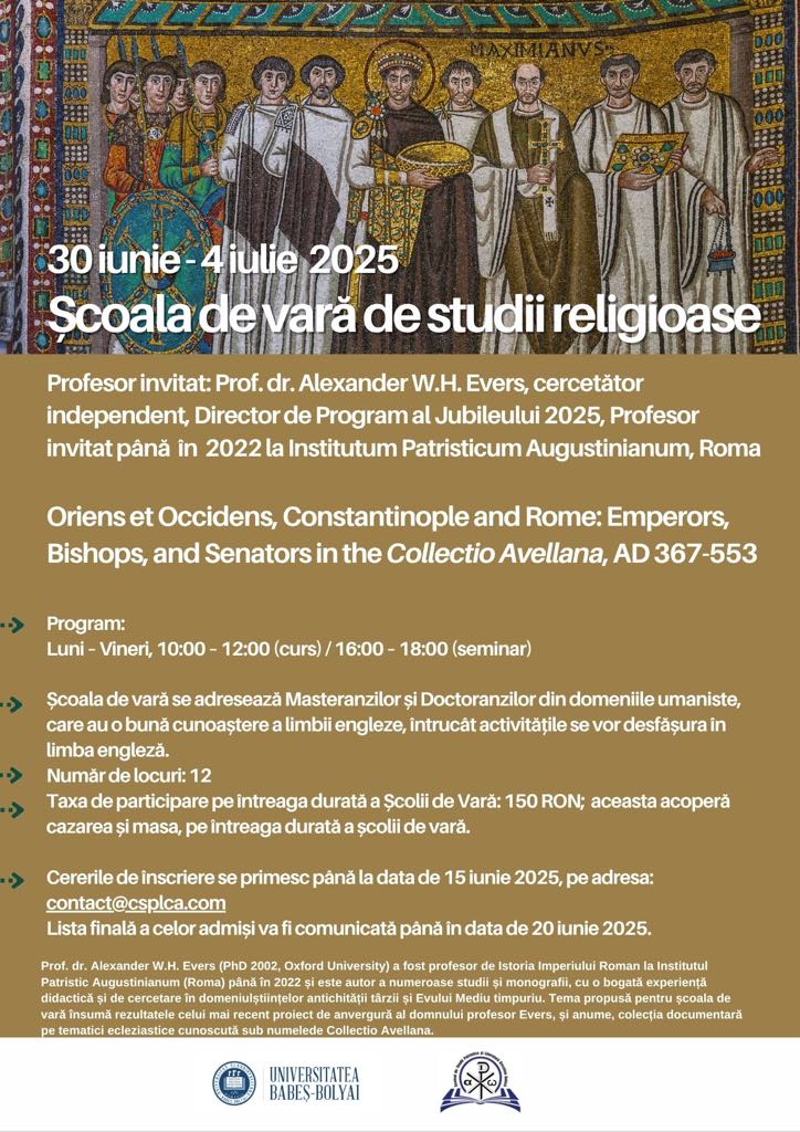 Prof. dr. Alexander W.H. Evers (PhD 2002, Oxford University) a fost profesor de Istoria Imperiului Roman la Institutul Patristic Augustinianum (Roma) până în 2022 și este autor a numeroase studii și monografii, cu o bogată experiență didactică și de cercetare în domeniul științelor antichității târzii și Evului Mediu timpuriu. Tema propusă pentru școala de vară însumă rezultatele celui mai recent proiect de anvergură al domnului profesor Evers, și anume, colecția documentară pe tematici ecleziastice cunoscută sub numele de Collectio Avellana.